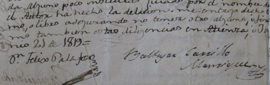El día 14 de mayo fue recibida la comisión por D. Félix Palafox, que prestó juramento y se comprometió a cumplirla cuando regresase D. Baltasar Carrillo, que se había ausentado unos días de Atienza: “Certifico, yo el infrascripto, Vicario Eclesiástico de esta Villa de Atienza y su Partido, que por el correo ordinario de ella, y en este día de la fecha, he recibido esta comisión, juro según mi estado y con la mano en el pecho, guardar fidelidad y secreto sobre lo contenido en ella, y practicar cuantas diligencias me ordena el Santo Tribunal de la Inquisición, luego que D. Baltasar Carrillo se restituya a esta, de la que se halla ausente por pocos días. Y para que conste, lo firmo en Atienza, y junio 14 de 1819. D. Félix Palafox.”