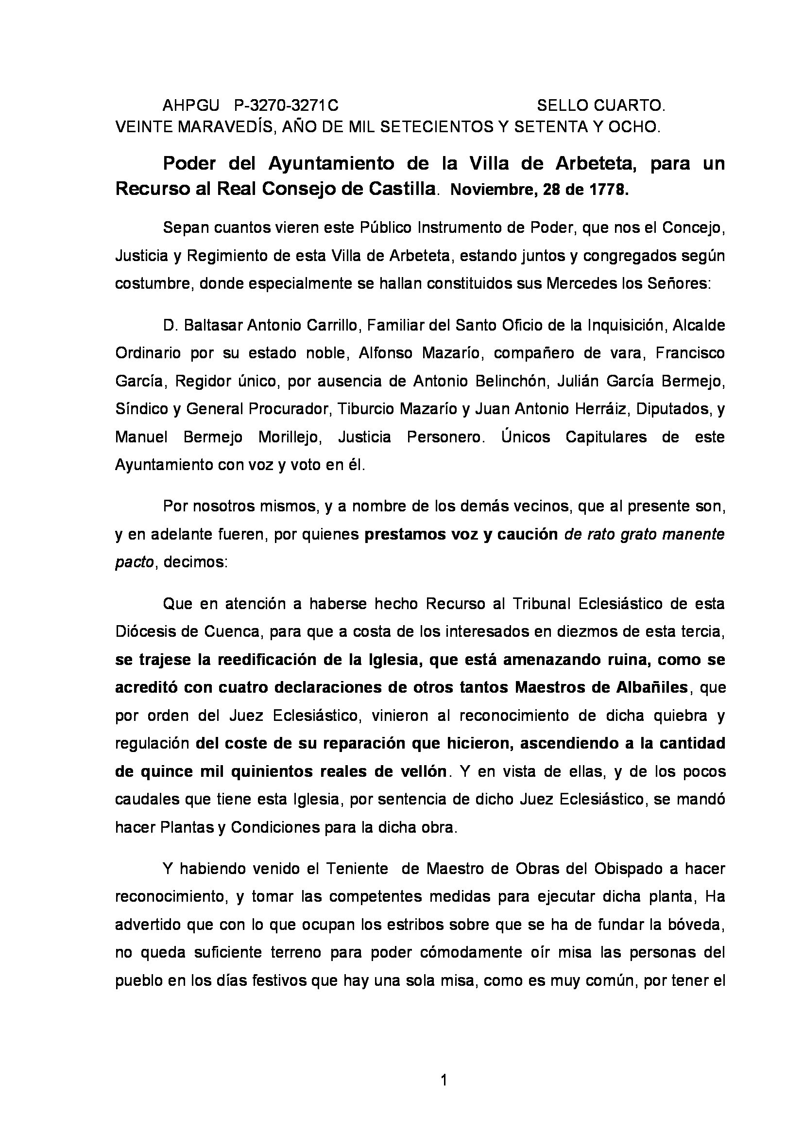 En el  documento de abajo el Ayuntamiento de Arbeteta otorga un Poder al Alcalde Ordinario  de la Villa  *Don Baltasar Carrillo * y a Don José Antonio Saíz, Procurador de los Reales Consejos para que les represente ante el Rey y Del Real Consejo de Castilla y  que consigan Licencia y permiso para la corta de los 1.500 pinos de los montes de Arbeteta y que el dinero que den se invierta en la reedificación de su iglesia.