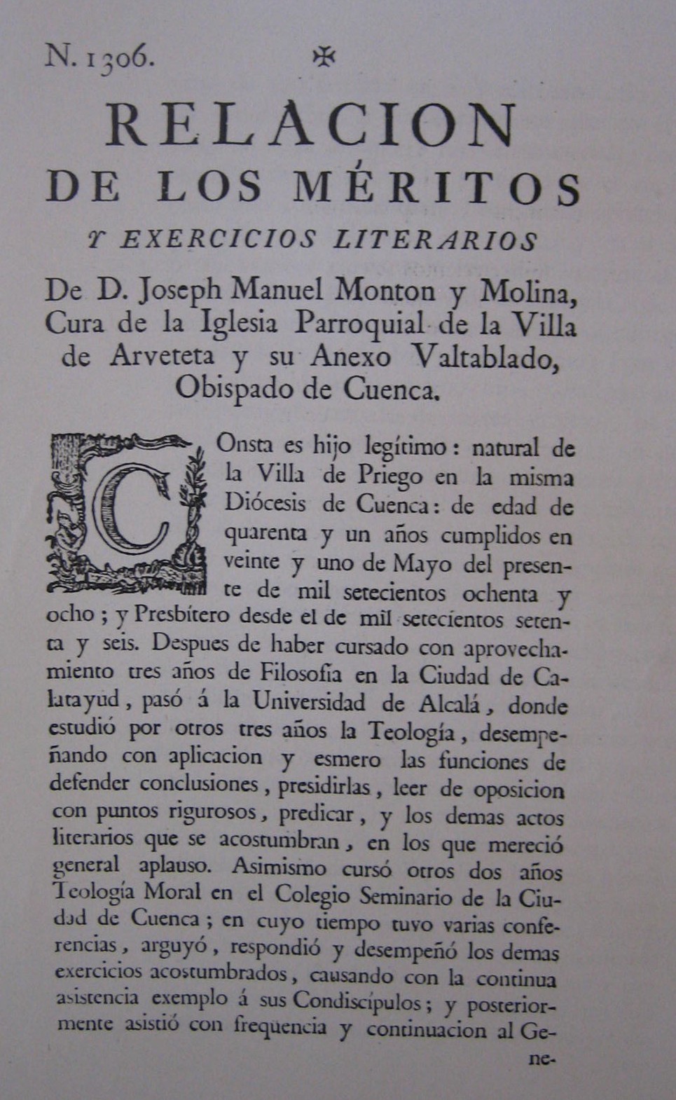 Relación de los méritos de D. Jose Manuel Montón cura de la Villa  de Arbeteta y su anexo Valtablado, Obispado de Cuenca.