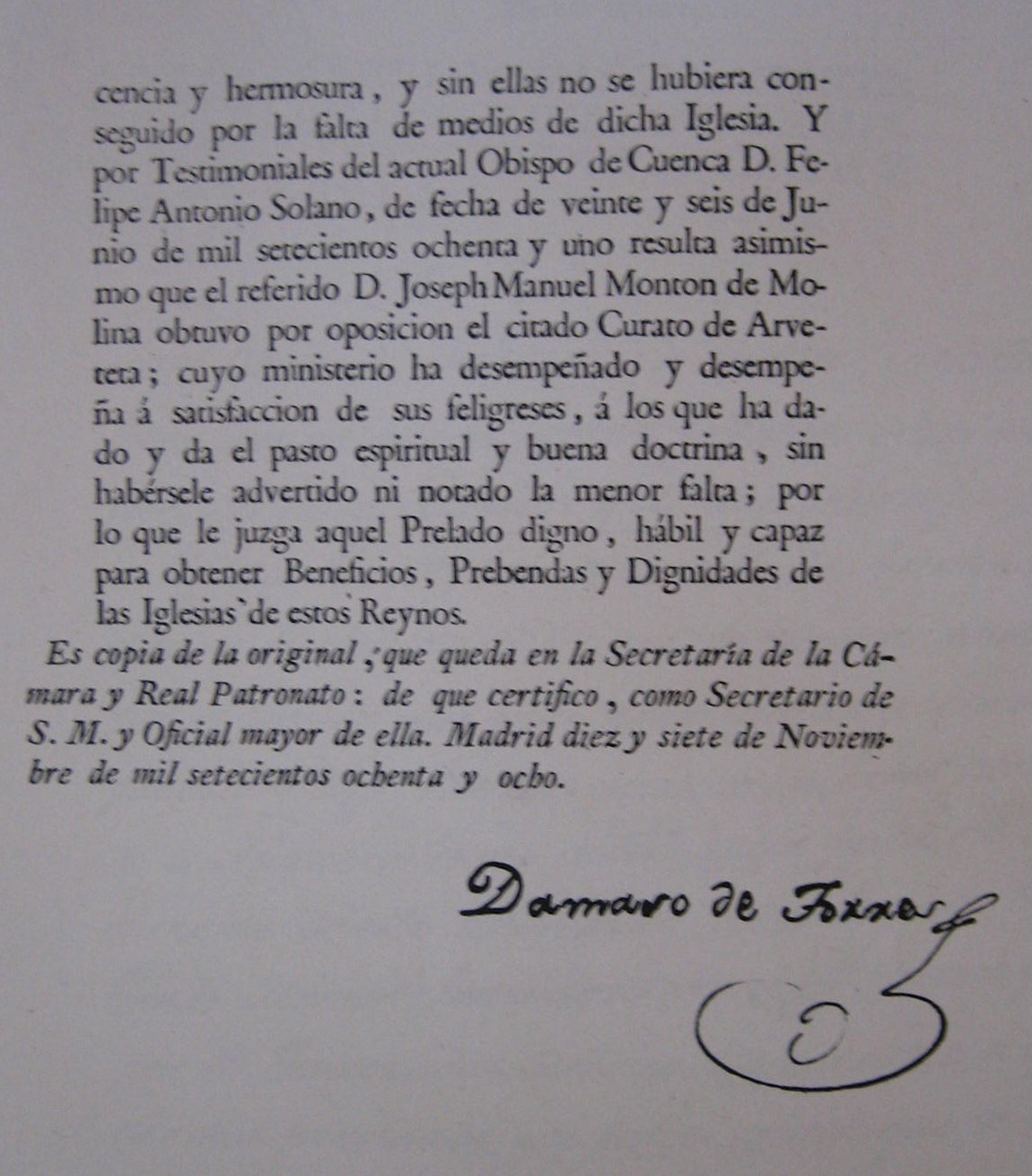 *Documento Original  de donación del Don José Manuel Montón párroco de la Villa de Arbeteta fechado el 17 de noviembre de 1788.