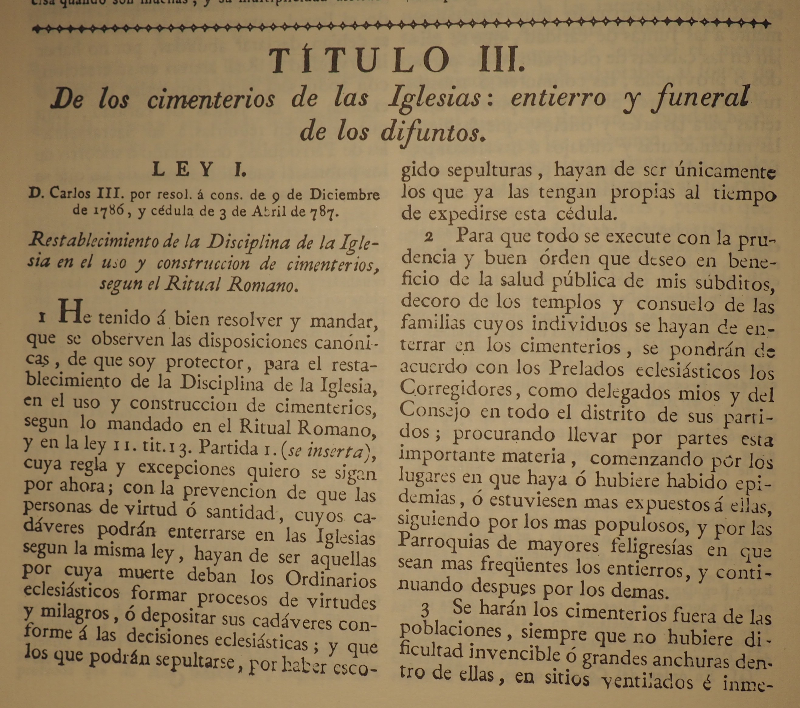 *Normativa de Carlos III sobre la obligatoriedad de sacar los muertos de las iglesias y la construcción de los cementerios fuera de los lugares.