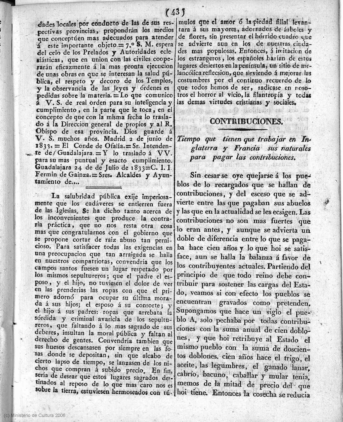 *Boletín Legislativo de la Provincia de Guadalajara sobre los enterramientos y el comportamiento de los sepultureros . Año 1833