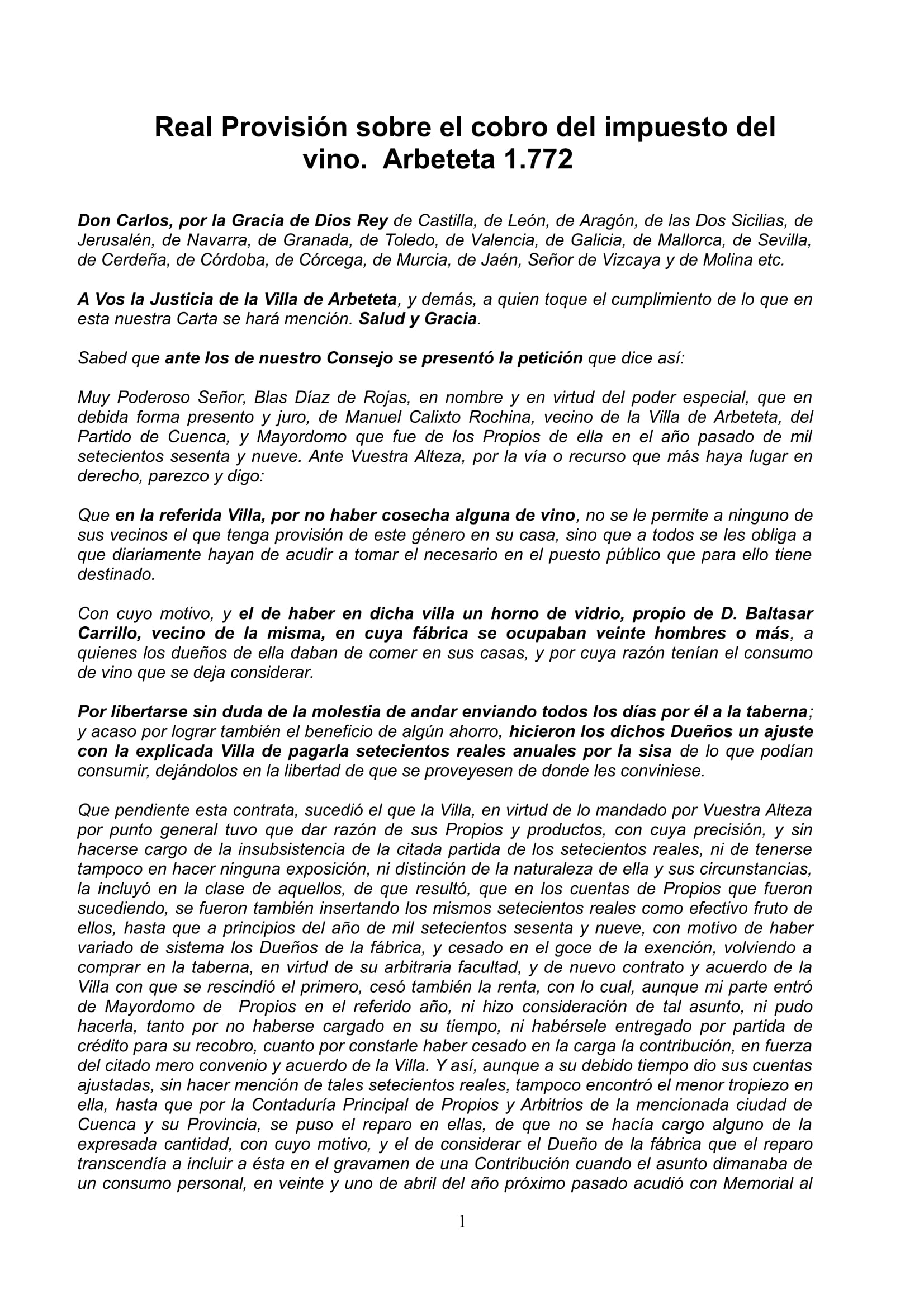 Pero vayamos a la primera: La Real Provisión sobre el cobro del impuesto del vino. Es de Carlos III, del año 1772 y la hemos encontrado en el Archivo Histórico Nacional (AHN CONSEJOS, 27662, EXP 1).