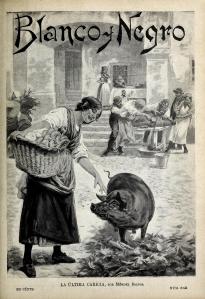 Diariamente el ama de casa ponía un caldero en el fuego de la cocina para cocer el alimento del cerdo, después de cocido lo vertía en la gamella, le añadía una porción de salvado y lo machacaba todo con un mazo, mezclándolo bien. A los niños nos gustaba el olor del guiso, especialmente si nos daban una pequeña patata. Cuando la comida estaba lista, se soltaba al cerdo, que acudía con ansiedad. A los muchachos también nos mandaban en primavera a coger gamones tiernos, que también terminaban en el caldero. El modo de engordar el cerdo es uno de los puntos más importantes del régimen económico del animal, pues de él dependerá  el beneficio que sacará el vecino.