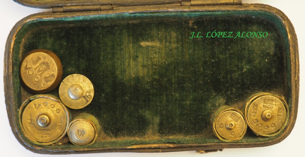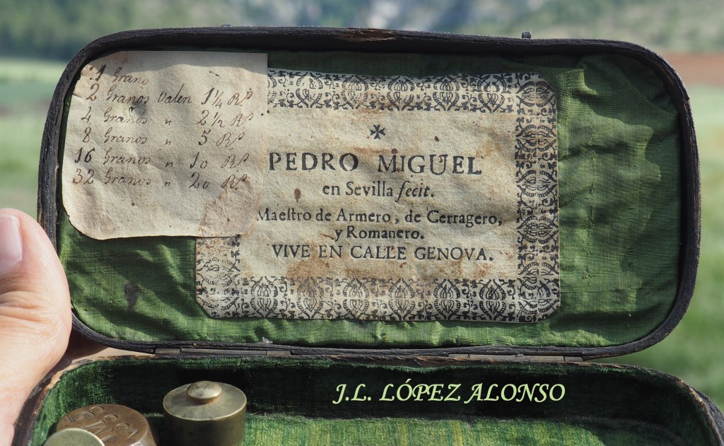 Este objeto es una caja metálica de 16 x 8 x 3 centímetros, que en su interior conserva una pequeña balanza con tabla de pesas. Hemos averiguado que el uso de dicha balanza era para pesar moneda. Según indicación que hay en el interior de la tapa, fue fabricada en Sevilla por Pedro Miguel Guerrero[1] “maestro armero, cerrajero y romanero”. La caja es original, conserva 4 pesos de bronce y otros dos añadidos. Los 4 pesos se hallan guardados en depósito habilitado del estuche, y otros dos sueltos. Hemos podido comprobar que fue fabricada en torno a 1770.