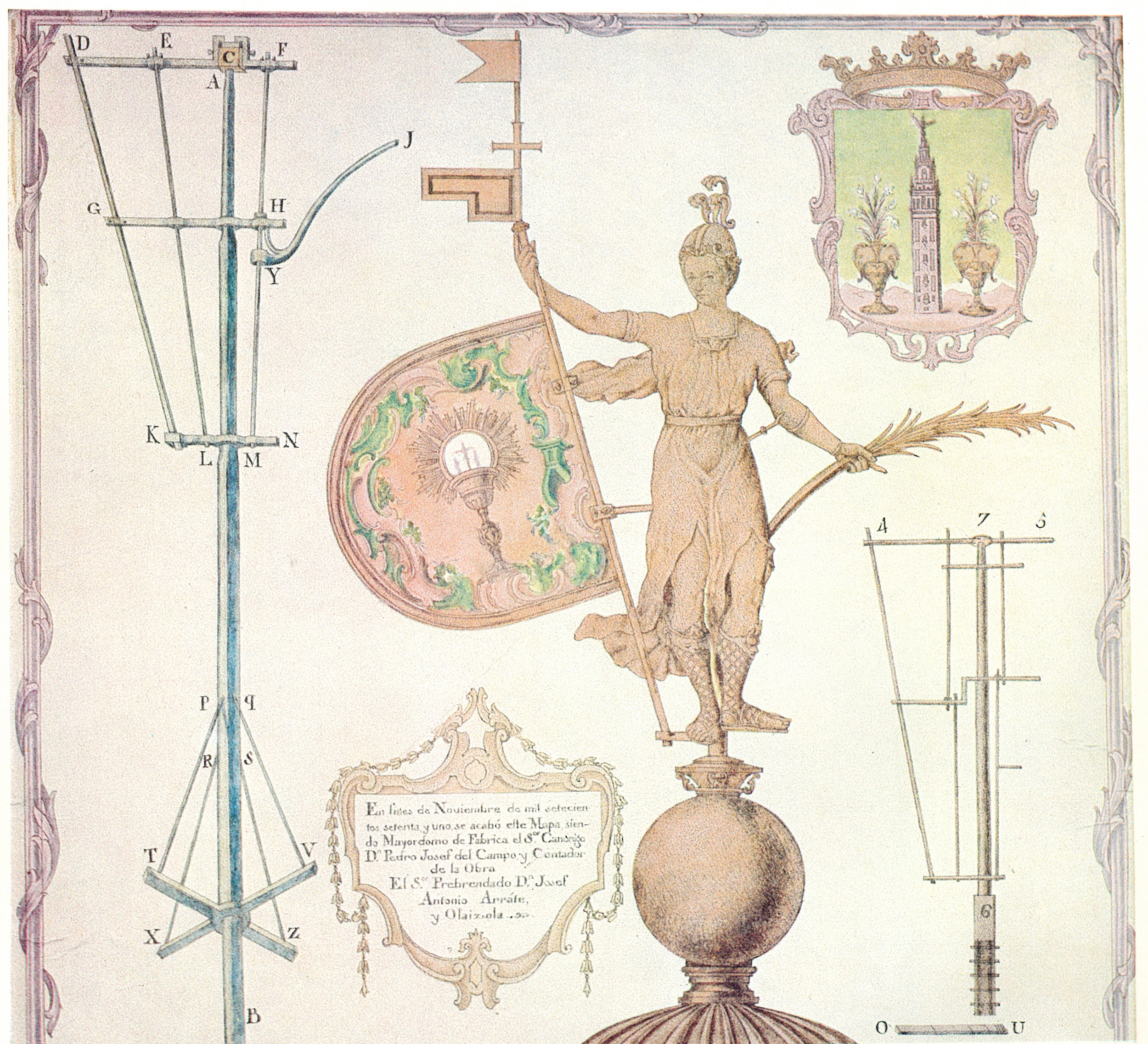 [1] Encontramos a Pedro Miguel Guerrero como director de la restauración del Giraldillo que hay en lo alto de la Giralda de Sevilla, en 1770. Encontramos planos y diseño de la veleta que sirvió seguramente de modelo a la construcción del Mambrú 16 años después.