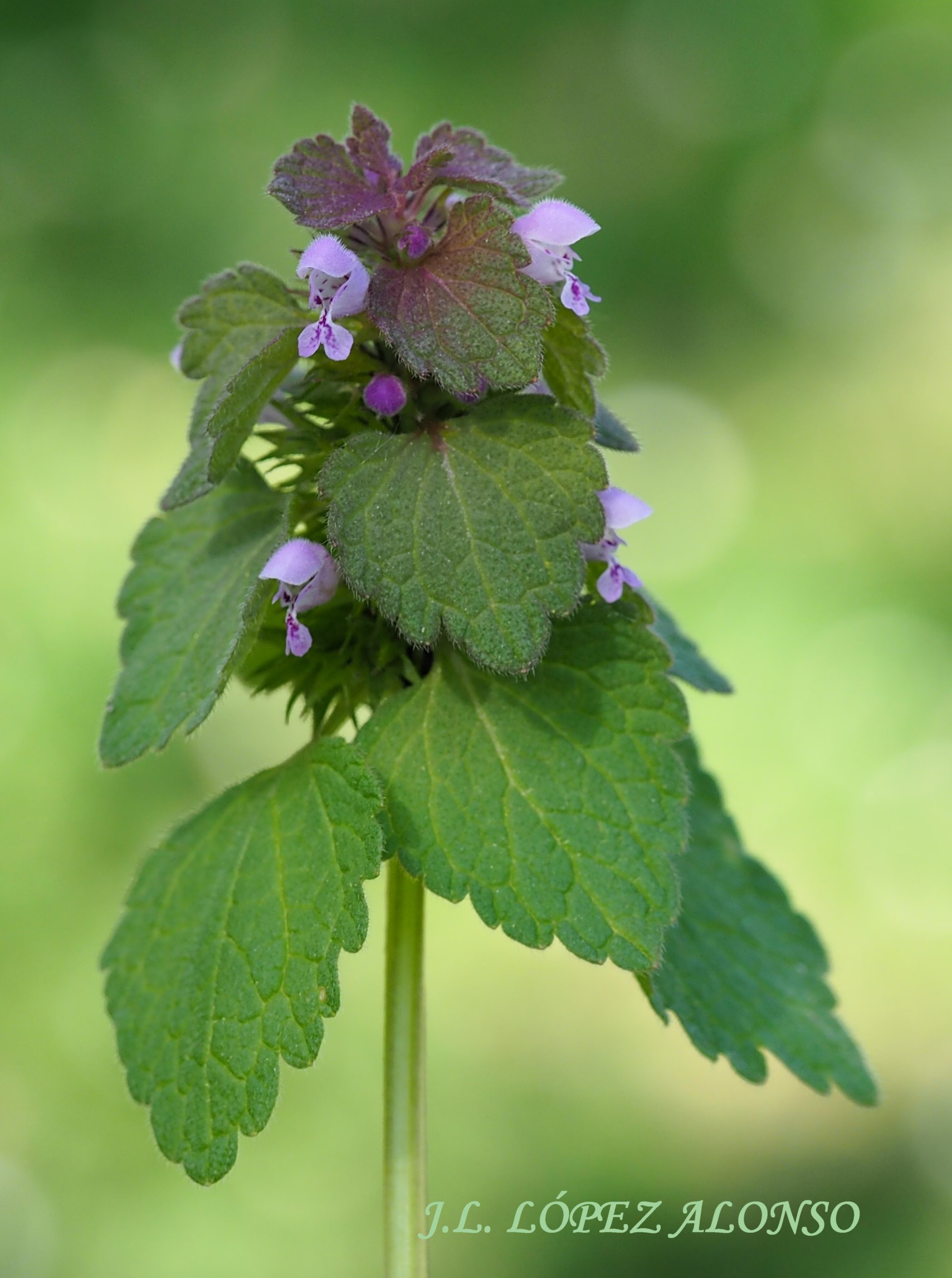 LAMIUM PURPUREUM. Ortiga roja. Planta anual en cuyo tallo cuadrangular casi desnudo se ordenan en forma de pirámide hojas y flores. Crece en borde de caminos y zonas de praderas. Tiene múltiples propiedades farmacológicas.