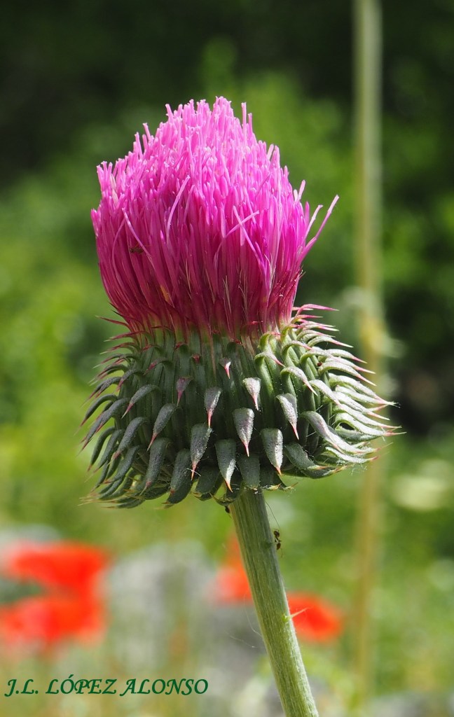 ONOPORDUM ACANTHIUM. Cardo borriquero. Su nombre científico procede del griego onopordum, pedo de burro, por la propiedad de la planta de producir ventosidades ruidosas a los burros cuando se las comían; y del latín acantium “espinoso”.