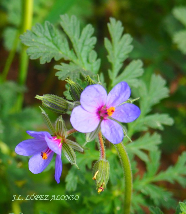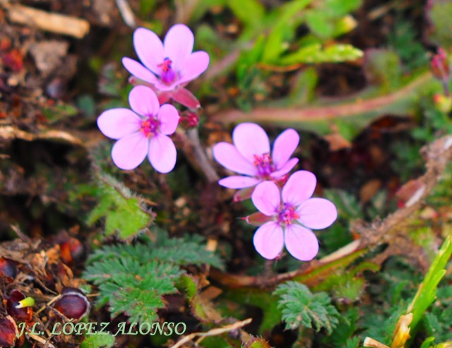 ERODIUM (Alfilerillos)Su nombre científico quiere decir “garza”, por la semejanza que tiene el fruto de esta planta con el pico del ave. Se denomina también agujas de pastor. Tiene las flores agrupadas con cinco pétalos roas y azulados. Es una excelente planta forrajera, que ha sido utilizada con fines medicinales (astringente, diurética, sudorífica…etc.). Existe un gran número de especies de esta familia. En Arbeteta hemos localizado e identificado estas tres: