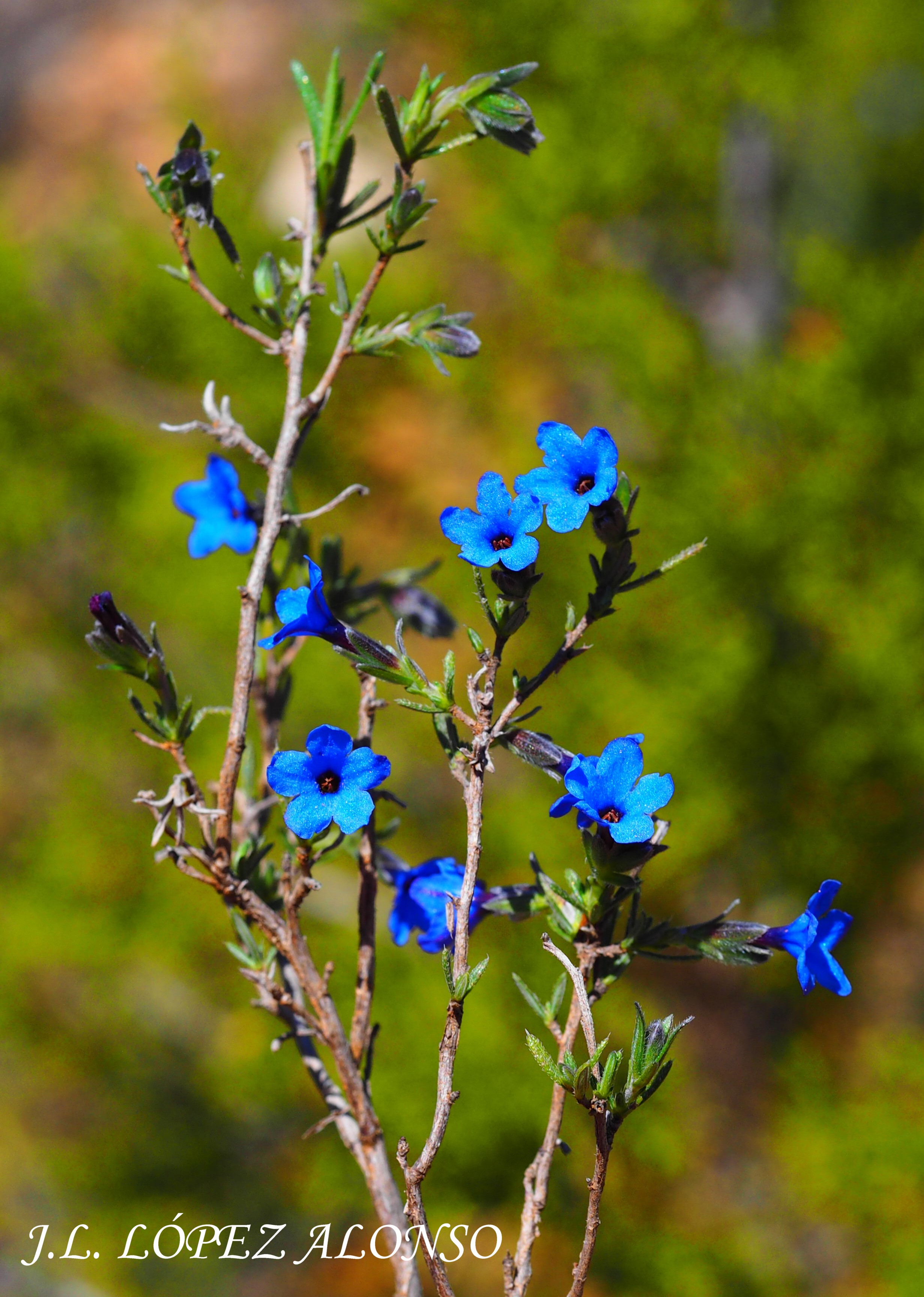 LITHODORA FRUTICOSA (asperón): Es un pequeño arbusto que llega a 1 metro, con tallo muy ramificado. En Arbeteta lo hemos encontrado en la Hoya del Palancar y en la ladera de la Cabeza del Gallo. Las flores son de un intenso azul-violeta. Se la denomina también hierba de las 7 sangrías, porque era utilizada por los antiguos cirujanos para practicar las sangrías que realizaban con fines curativos. “El que toma asperón no tiene alta la tensión”, dice el refrán de la sierra de Cuenca.