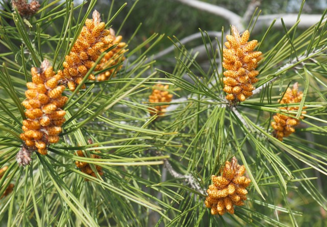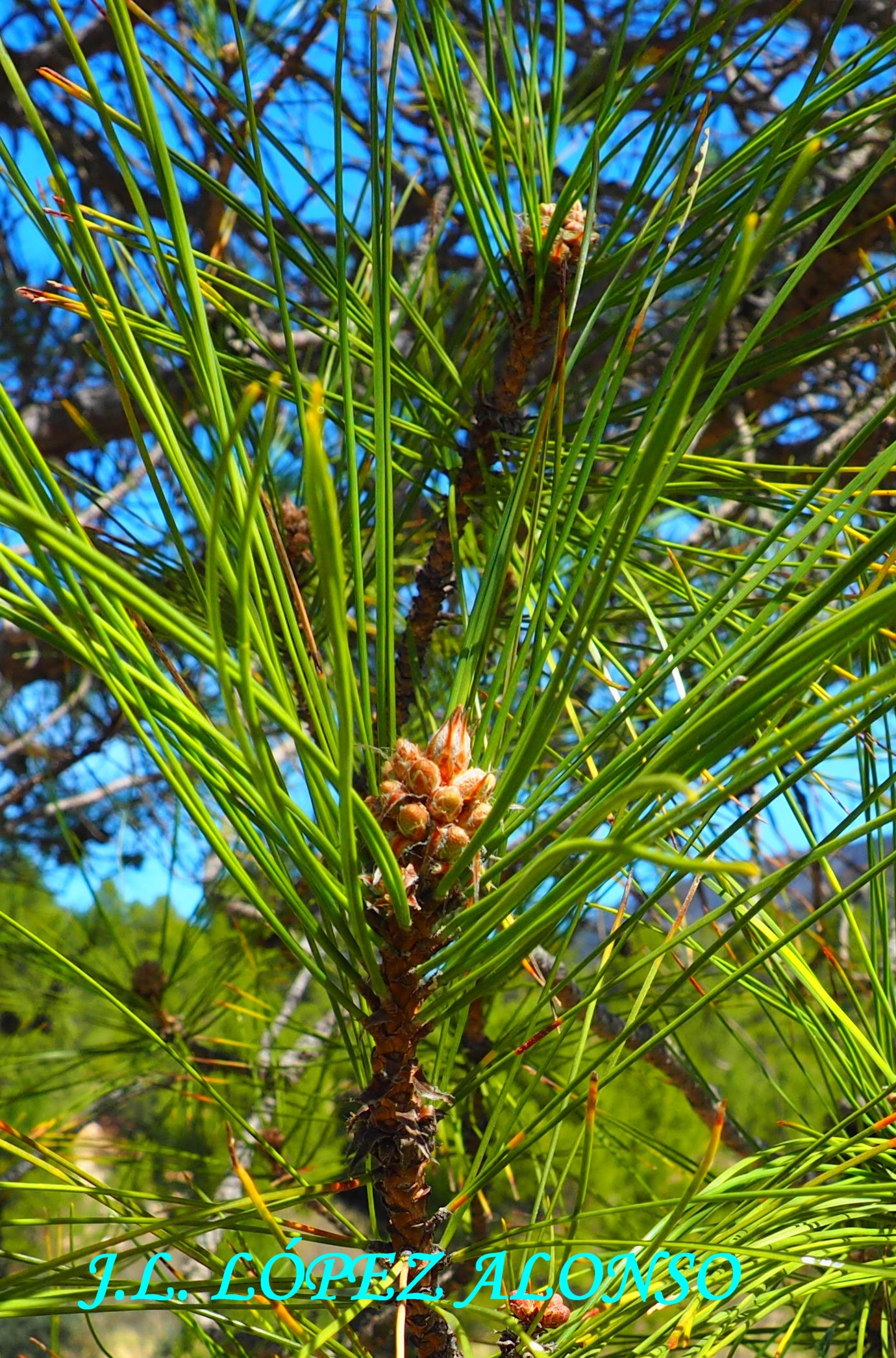 PINUS HALEPENSIS (pino carrasco): Este pino florece también de abril a mayo. Ha sido muy empleado en las repoblaciones más recientes. En Arbeteta lo vemos menos que el pinaster. Soporta bien las altas temperaturas y sequías. Su madera sólo se utiliza para la producción de celulosa, ya que el tronco no suele ser muy recto.