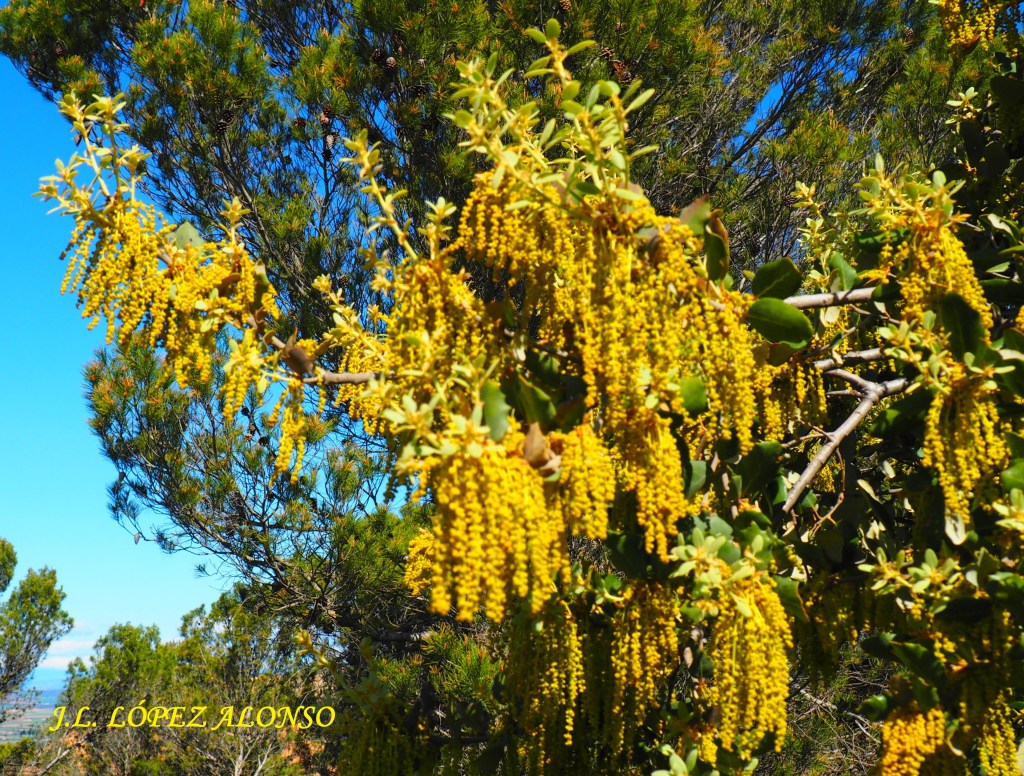 QUERCUS ILEX (encina): Árbol al que también denominaos chaparro en su fase más joven. En Arbeteta la encontramos en el oeste y norte del término municipal. Florece entre abril y mayo. Las flores son de color dorado. Tiene flores masculinas y femeninas, siendo las masculinas las más visibles, y las femeninas las que producen las bellotas. De ahí el refrán: “encina con moco, en la montanera da poco”. El “moco” son las flores masculinas.