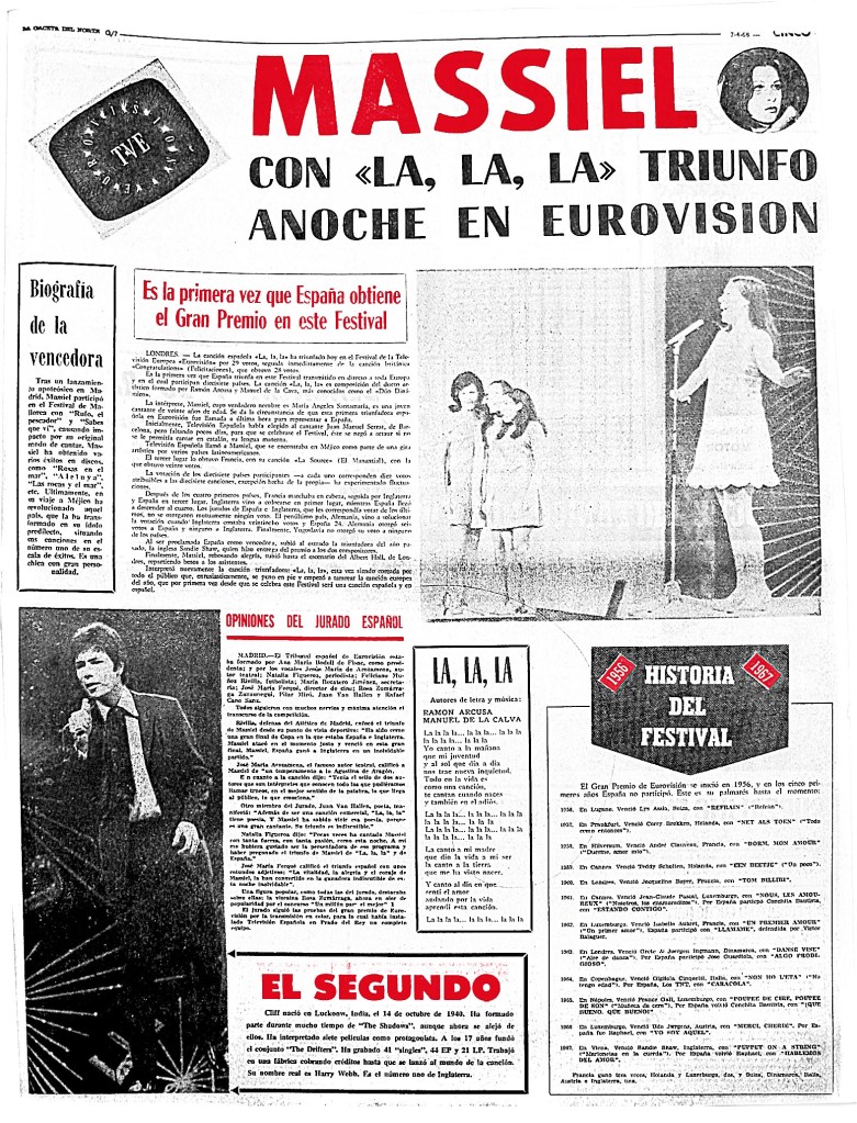 Lo cierto es que Massiel no era la elegida para representar a España en la edición de 1968. A tan solo unos días de celebrar el Festival, el por aquel entonces encargado de interpretar la canción, Joan Manuel Serrat, propuso cantar «La la la» en catalán. Ante la negativa de Televisión Española, el cantante abandonó el barco aun habiendo hecho la promoción por Europa y en un tiempo récord tuvieron que encontrar una sustituta. Aquí entra en juego Massiel. Abandonó su gira en México y en solo una semana aprendió, grabó y promocionó la canción. El cambio y esfuerzo merecieron la pena, pues Massiel llevó a España al primer puesto, obteniendo así el reconocimiento de ser la primera cantante de nuestro país en ganar el Festival de Eurovisión.